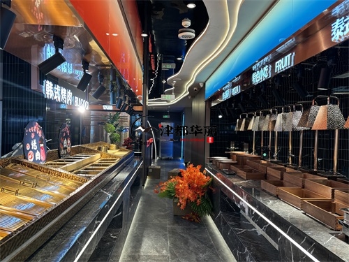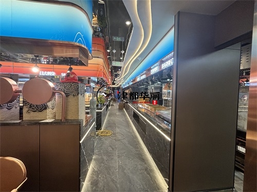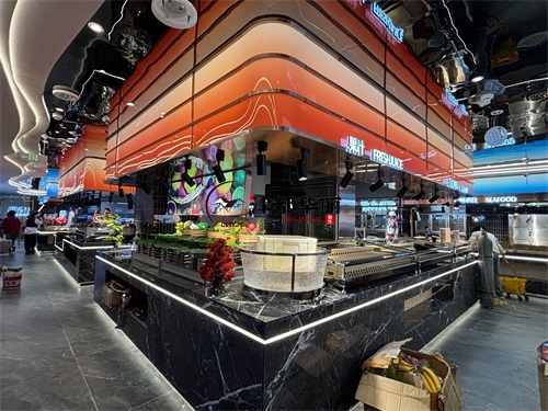 今天分享的是泾源回香渔自助餐厅装修设计实景,这家自助餐厅装修设计将“潮流科技感”与“轻奢休闲风”两种风格巧妙融合在一起,既贴合当下年轻消费群体的审美偏好,又通过空间层次的营造兼顾了自助餐饮的功能需求,是近年餐饮空间设计的典型流行范式。前厅的顶面与墙面采用波浪形的曲面造型,搭配橙红、宝蓝等高饱和度渐变色彩,叠加内嵌式线性灯带的勾勒,既打破了传统餐厅的规整感,又通过科技感的光影营造出“赛博休闲”的氛围——这种手法既借鉴了网红餐饮的“打卡属性”设计,又通过色彩分区(如橙红对应热菜区、宝蓝对应海鲜区)实现了功能引导,让顾客能快速识别餐区类型。